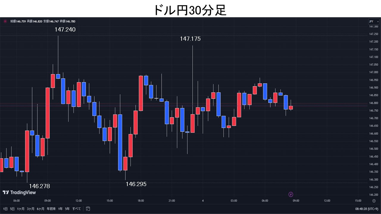 東京時間、ドル円は、日銀の早期利上げ観測後退を背景にドル買いが先行すると、一時147.24円まで上昇。その後は、ポジション調整が入り146.40円前後まで失速。欧州時間、ドル円は、本邦輸出企業のドル売り観測などで146.29円まで下押しとなるが、その後は下げ渋りとなった。NY時間、9月米ISM非製造業景況指数が54.9と予想の51.7を上振れると、ドル円は147.17円まで上昇。その後は、中東情勢の緊迫化を懸念し、ドル円は146円台後半で揉みあいとなった。