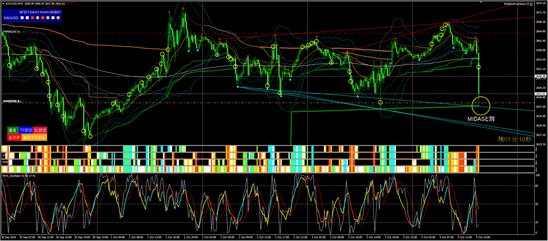 根拠は、1時間足のMKチャネル偏差3倍と、「無双の剣」ラインからの、反応⇒反転です。