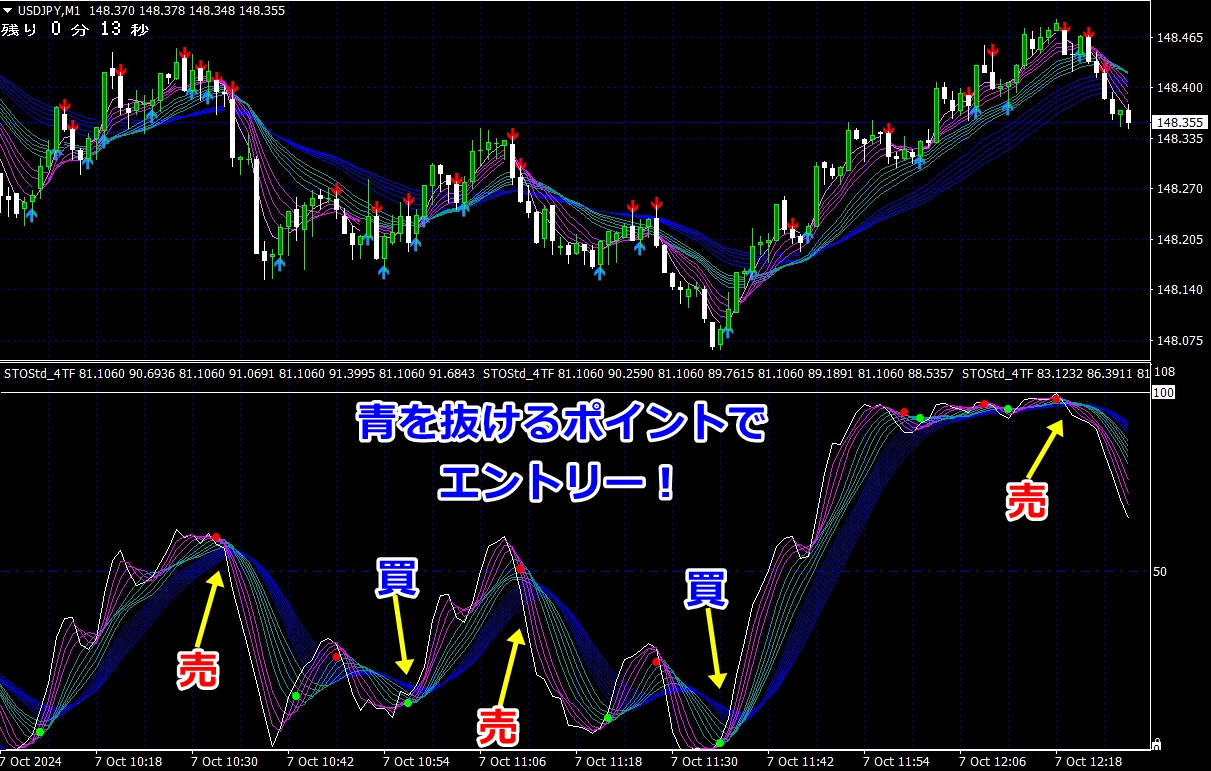 ※ サイン点灯=エントリーではありませんので、インジケーターが緑帯をすくい上げるような形状でない場合は、エントリーしません(サイン点灯でエントリーできる頻度は、数回に1度くらいです)。