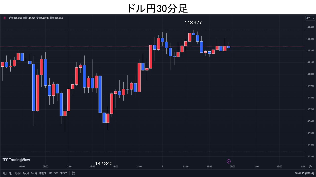 東京時間、ドル円は、早朝に日経平均先物の下落を受け147.59円まで下落。その後、本邦実需のドル買い観測で148円台を回復。香港株の急落を受けリスク回避の円買いで、ドル円は147.51円まで下落となるが、その後買戻しが先行。欧州時間、中東情勢緊迫化やアジア各国の株価指数が下落した事を受け、リスク・オフの円買いが先行し、ドル円は一時147.34円まで下落。NY時間、米10年債利回りの上昇や日経平均先物が堅調に推移した事を受け、ドル円は148.37円まで上昇。