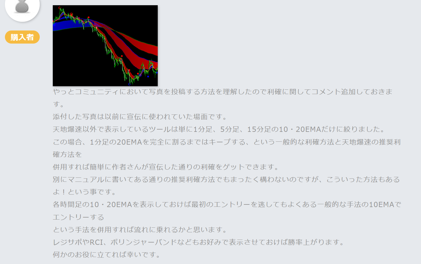添付した写真は以前に宣伝に使われていた場面です。 天地爆速以外で表示しているツールは単に1分足、5分足、15分足の10・20EMAだけに絞りました。 この場合、1分足の20EMAを完全に割るまではキープする、という一般的な利確方法と天地爆速の推奨利確方法を 併用すれば簡単に作者さんが宣伝した通りの利確をゲットできます。 別にマニュアルに書いてある通りの推奨利確方法でもまったく構わないのですが、こういった方法もあるよ!という事です。 各時間足の10・20EMAを表示しておけば最初のエントリーを逃してもよくある一般的な手法の10EMAでエントリーする という手法を併用すれば流れに乗れるかと思います。 レジサポやRCI、ボリンジャーバンドなどもお好みで表示させておけば勝率上がります。 何かのお役に立てれば幸いです。