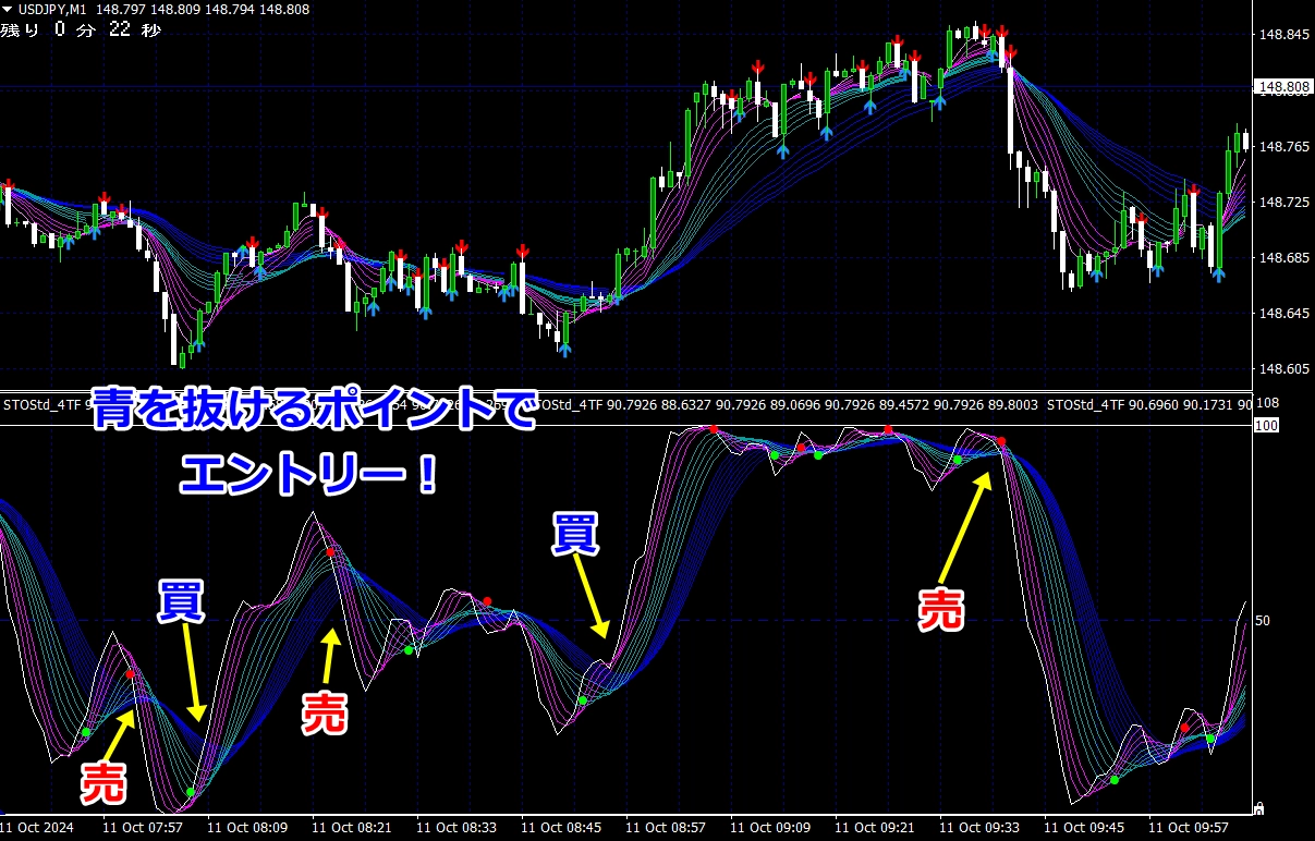 ※ サイン点灯=エントリーではありませんので、インジケーターが緑帯をすくい上げるような形状でない場合は、エントリーしません(サイン点灯でエントリーできる頻度は、数回に1度くらいです)。