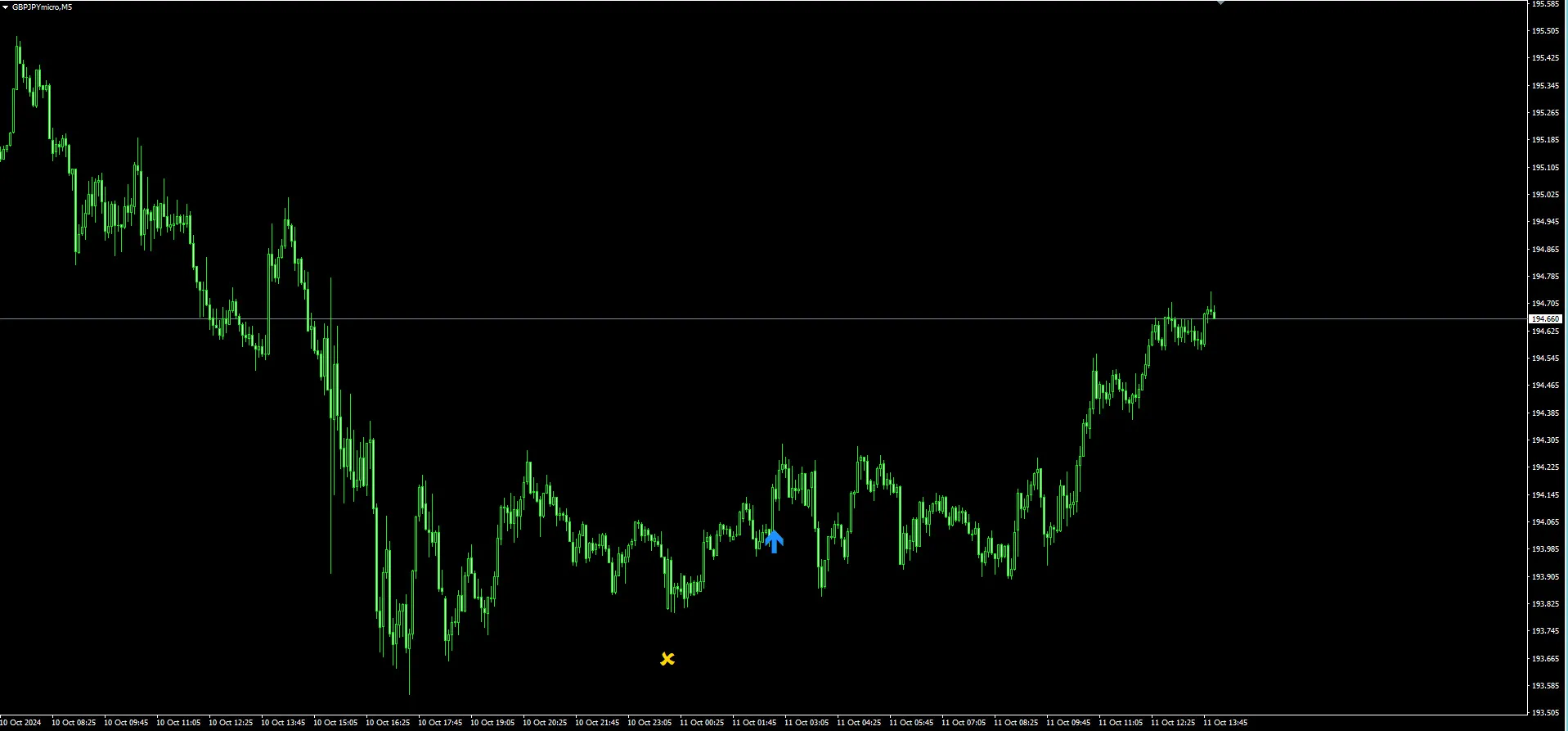 11日朝、ポンド円5分 売り利確サイン点灯後、8時45分に今度は買いエントリーサインが点灯!