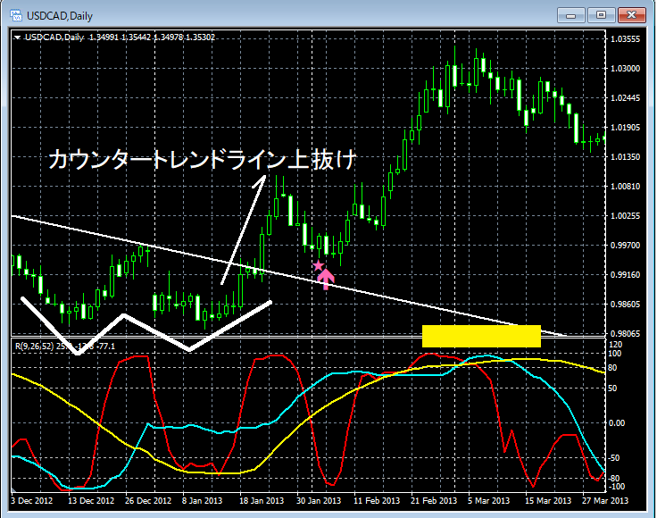 上位足の状況は省略。上の日足では、カウンタートレンドラインを上抜けしてさらにダブルボトムを形成して上昇。その後の下げでmBDSR(RCI2本フィルター)の押し目買いサインが点灯し、プライスはしっかり上昇している。