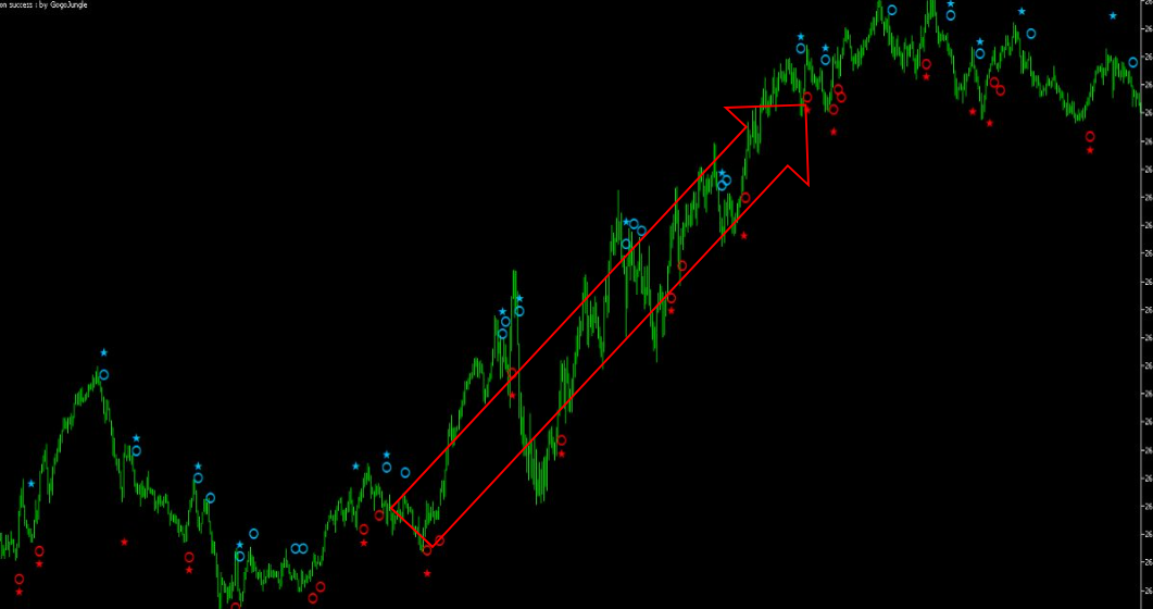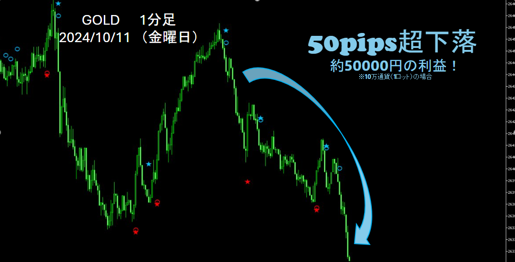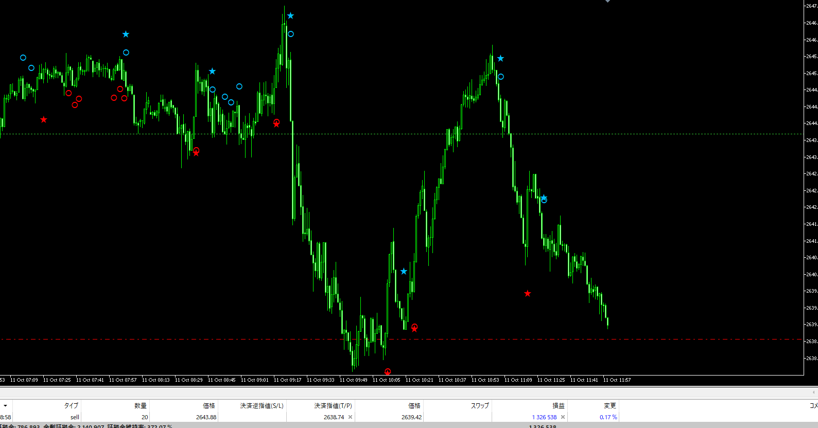 このインジケーターのエントリー条件は、☆と〇が揃った瞬間がチャンス!シンプルなルールで即座にエントリー判断ができ、効率よく利食いを目指せます。
