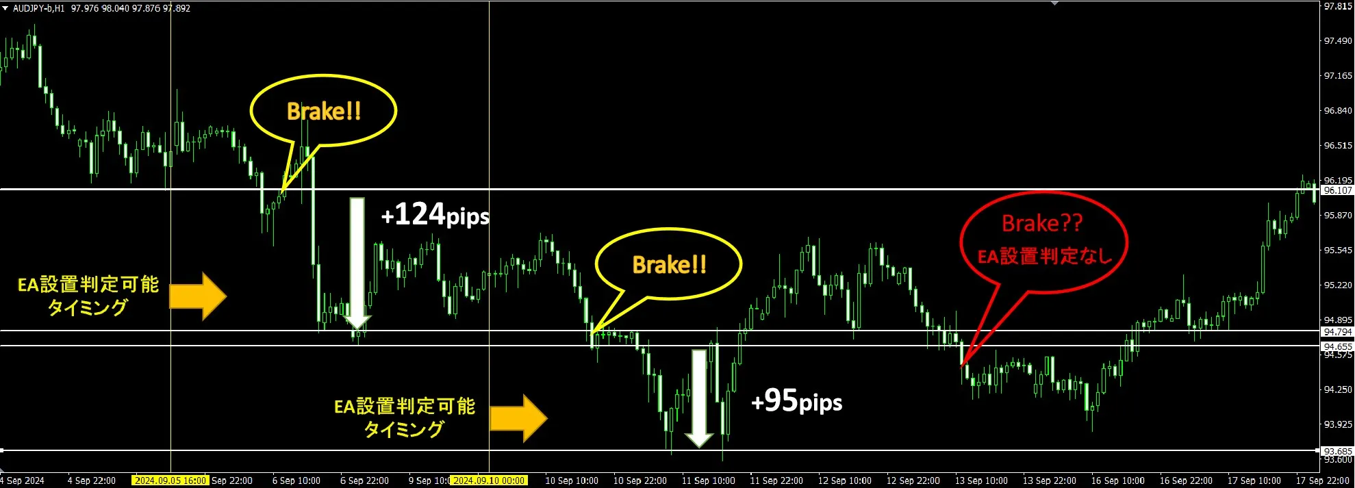 ※その後1時間足でレジサポラインにてブレイクアウトが発生しているように見えますが、価格は伸びず、最安値にタッチすることなく高値を切り上げていきました。この時のブレイクアウトでは手法によるEA設置判定はでていません。