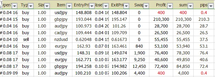 早くも今月は二週目が終わりましたが、Break Out 手法 DominantではGBP/JPYで一撃210pips得られたのが記憶に鮮明に残っています。その他のトレードでも堅実に利益を残すことができました。詳細は以下になります。