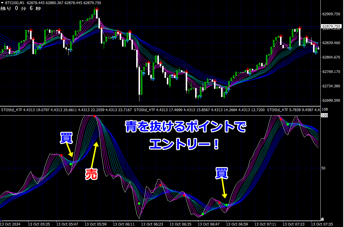 インジケーターの帯はピンク・緑・青の3層構造で、3層の帯は、収斂と拡散を繰り返しますので、 上昇時は、上から ピンク・緑・青 の並びとなり、下落時は、その逆で、上から青・緑・ピンクの並びになります。