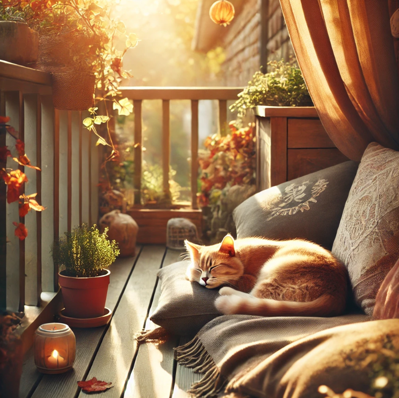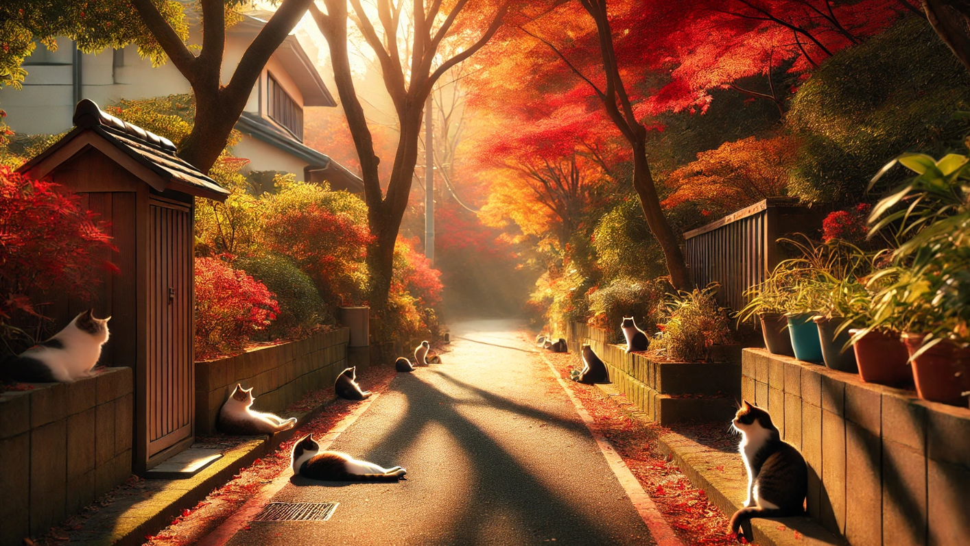 秋の澄んだ空気が漂う中、紅葉が少しずつ色づき始め、近所の猫たちもいつものように散歩道で日向ぼっこを楽しんでいました。