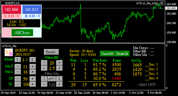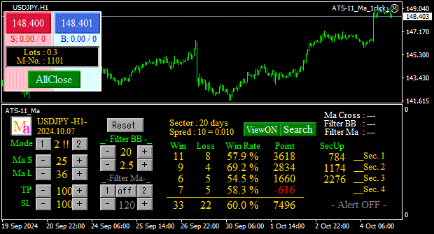 上の画像のように2つのチャートに『ATS-11 Ma』をセットして、以上の設定値でトレードを行ってみました。