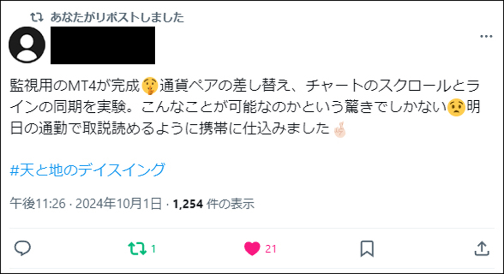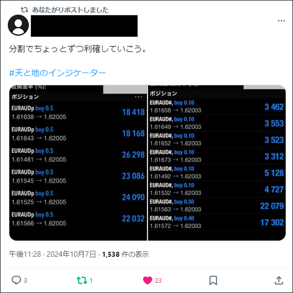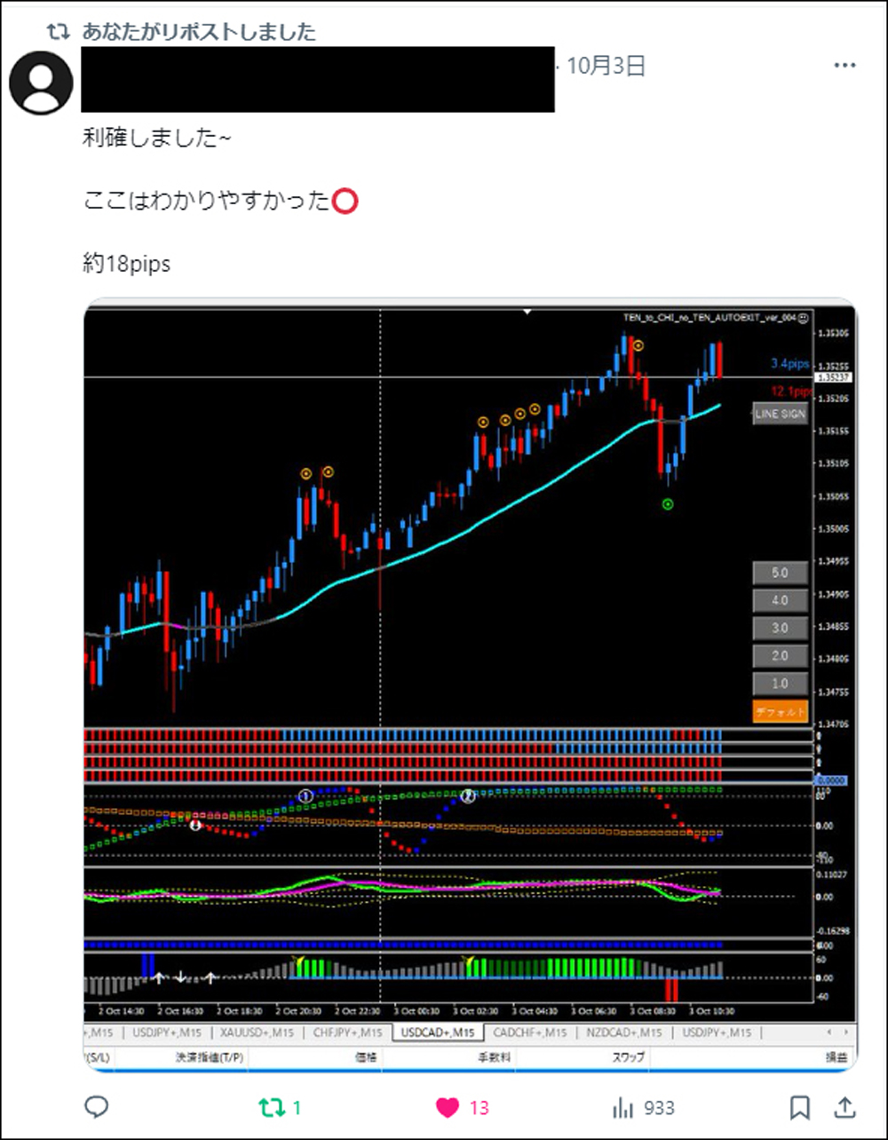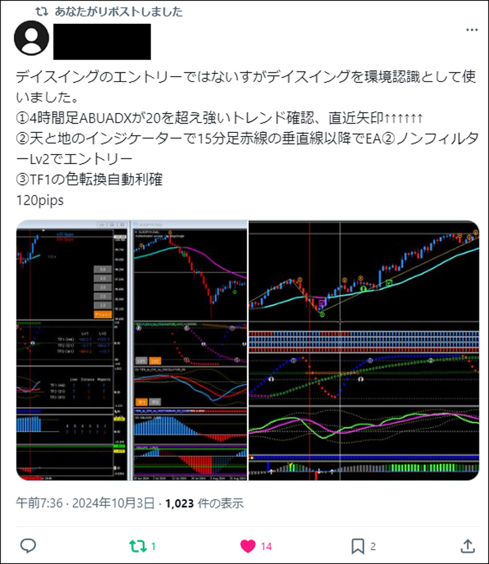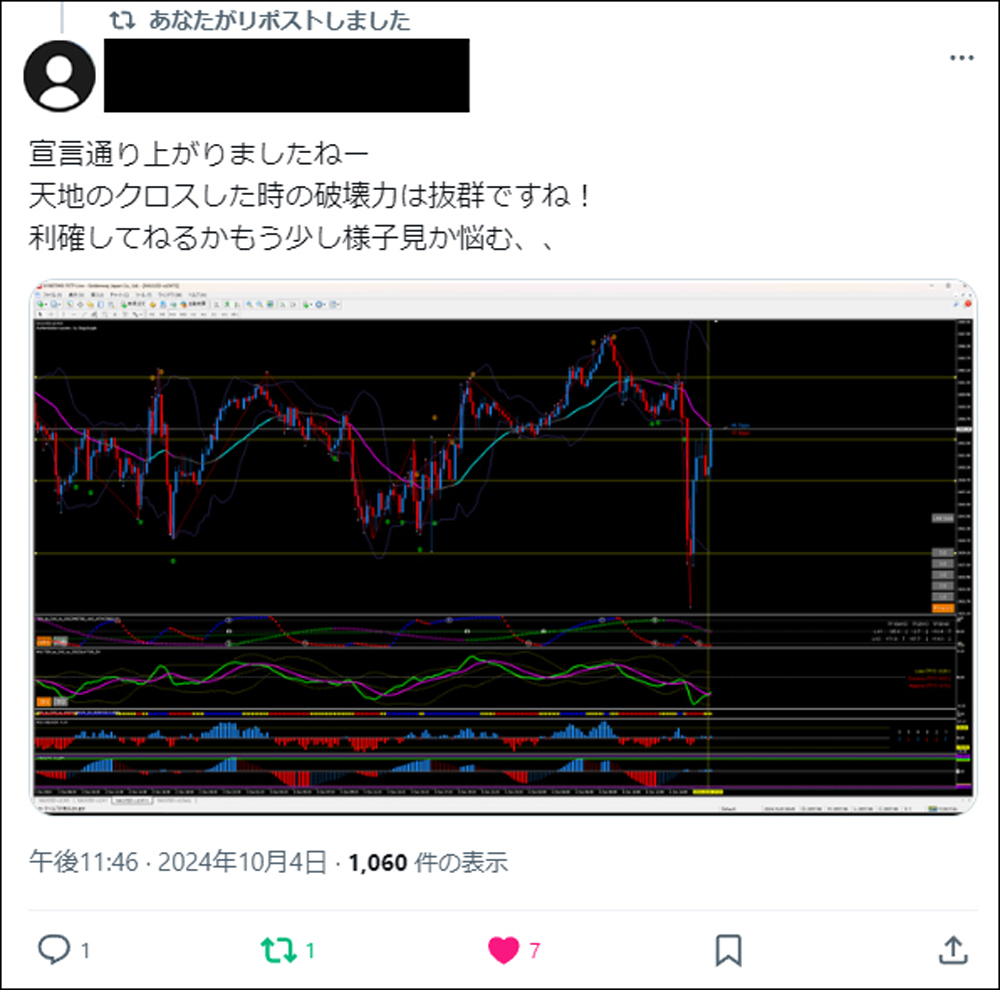 快く引き受けてくれた13名のモニター様には、2024年10月1日に天と地のデイスイングをお送りいたしました。それ以来、X(旧Twitter)でトレード履歴、使い心地、優位性など個々に感想をポストしてくれています。