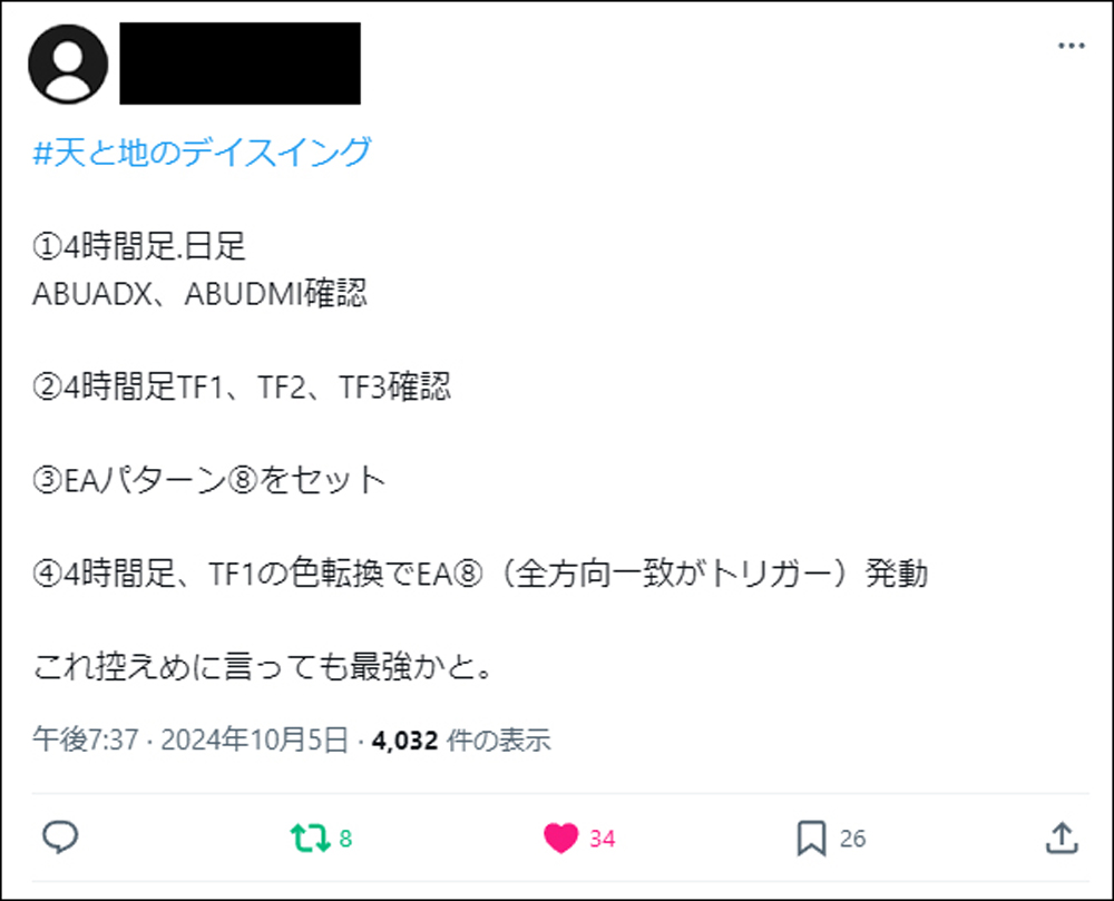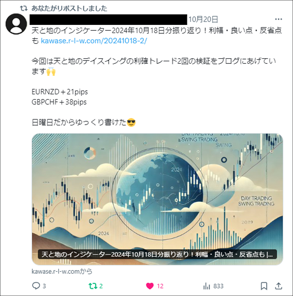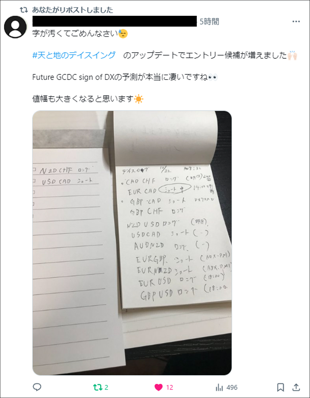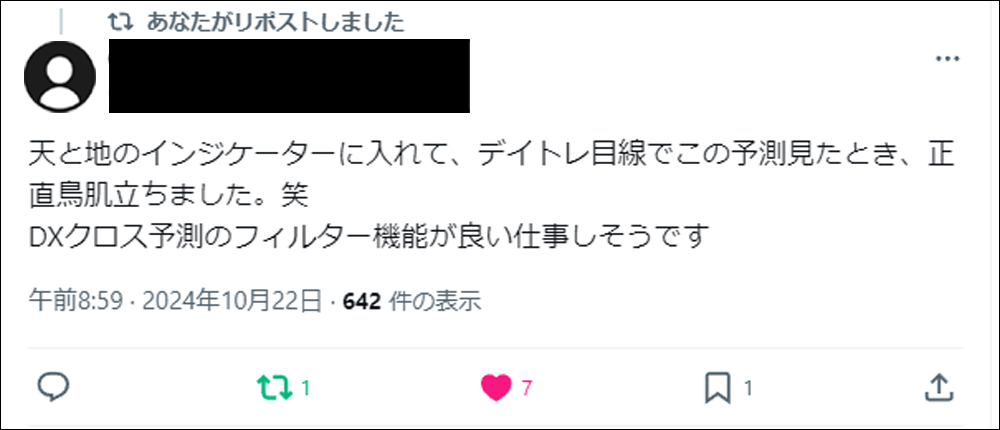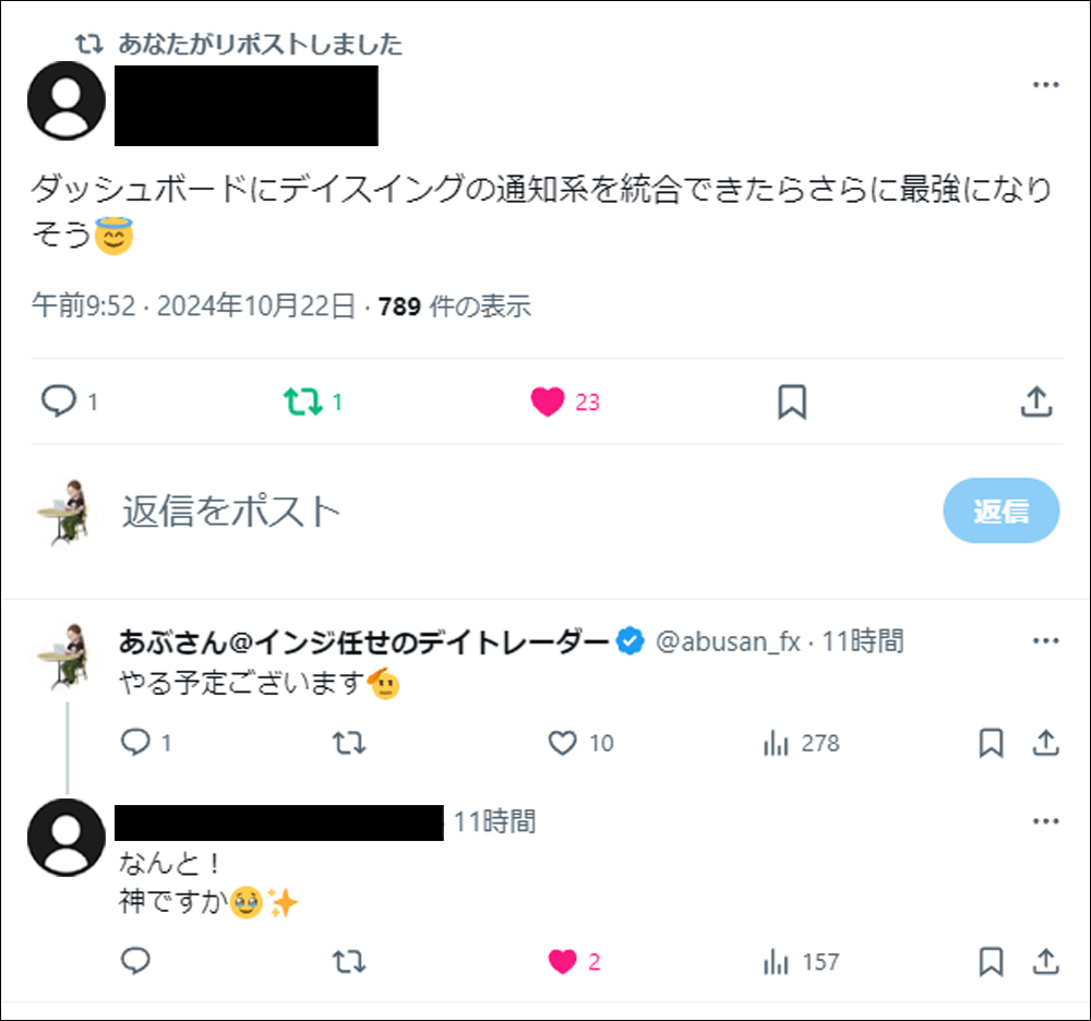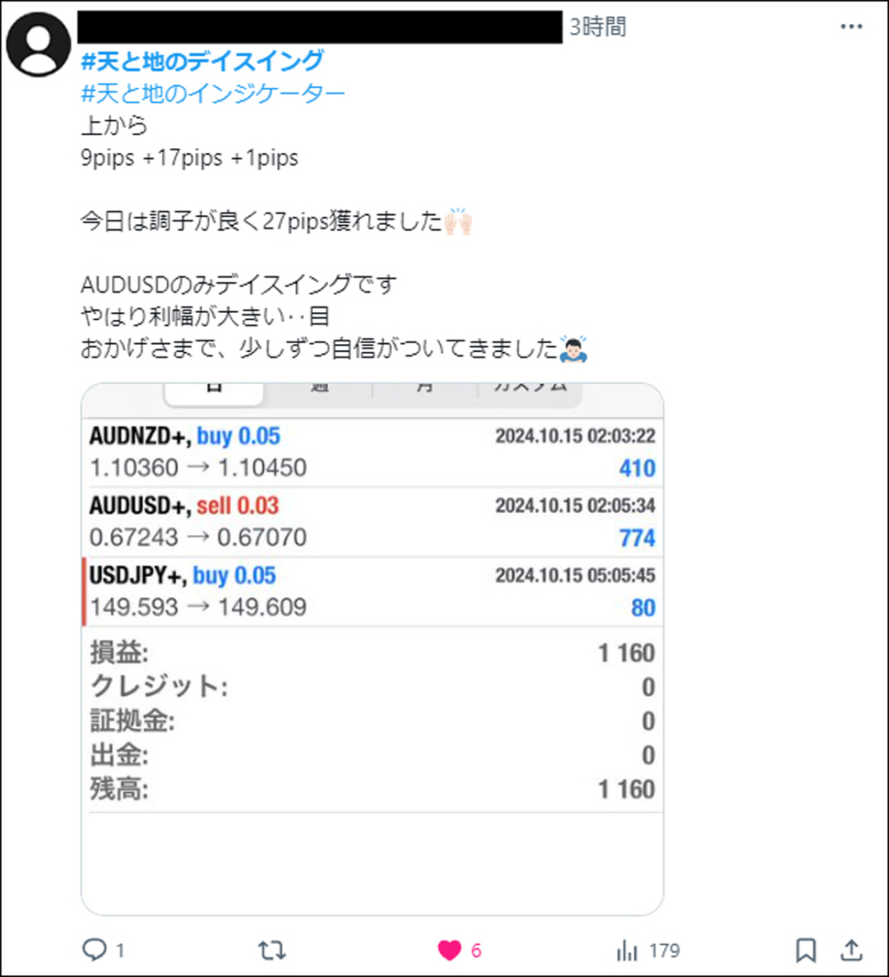 快く引き受けてくれた13名のモニター様には、2024年10月1日に天と地のデイスイングをお送りいたしました。それ以来、X(旧Twitter)でトレード履歴、使い心地、優位性など個々に感想をポストしてくれています。