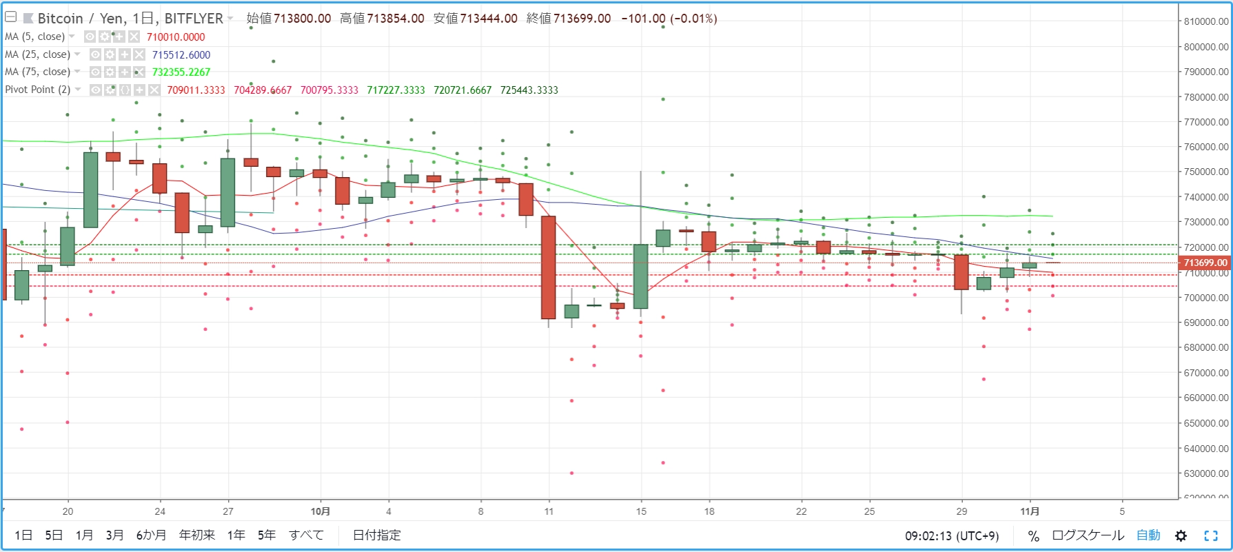 画像は2018年11月03日のキャプチャ。ここ数日は強気な銘柄が目立ち、「緑」が続いています。今日特筆すべきはビットコインキャッシュで、8%を超える上昇を見せています。そのほかのメジャーどころはおとなしい動きとなっています。