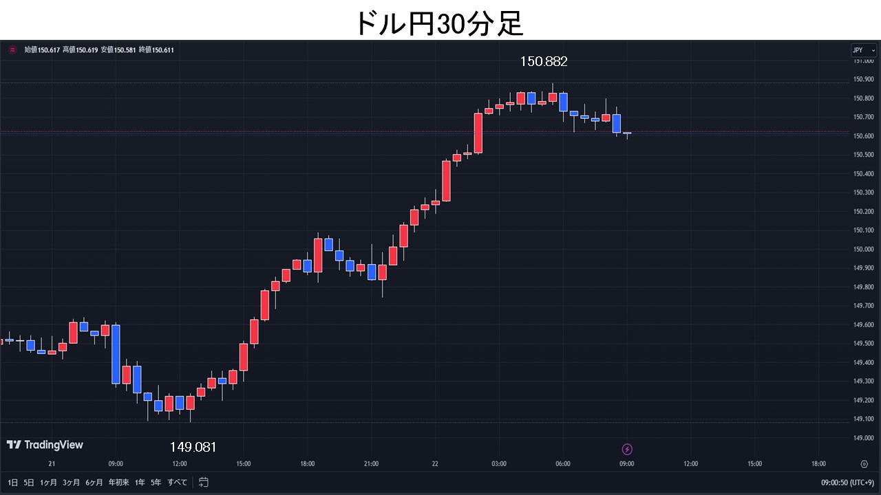 ドル円、米10年債利回り上昇受け150.88円と8/1の水準まで上昇。