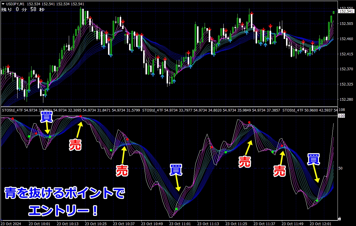 ※ サイン点灯=エントリーではありませんので、インジケーターが緑帯をすくい上げるような形状でない場合は、エントリーしません(サイン点灯でエントリーできる頻度は、数回に1度くらいです)。