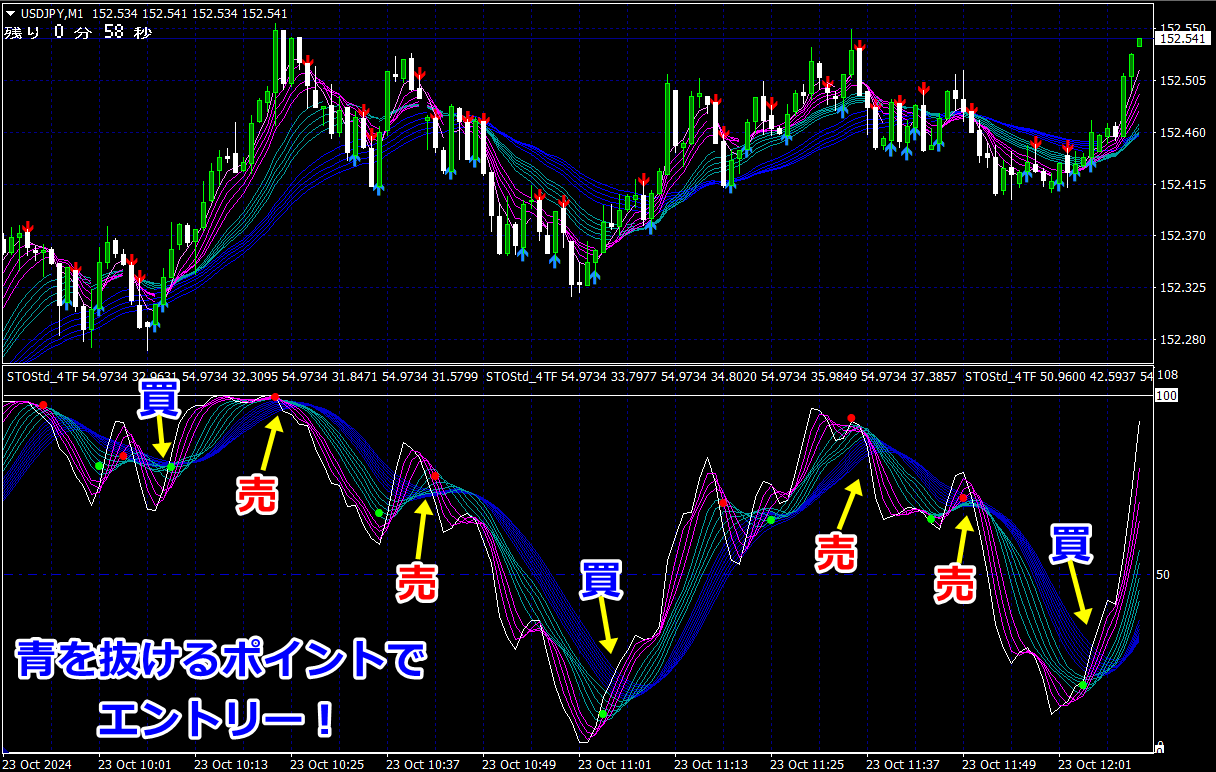 インジケーターの帯はピンク・緑・青の3層構造で、3層の帯は、収斂と拡散を繰り返しますので、 上昇時は、上から ピンク・緑・青 の並びとなり、下落時は、その逆で、上から青・緑・ピンクの並びになります。