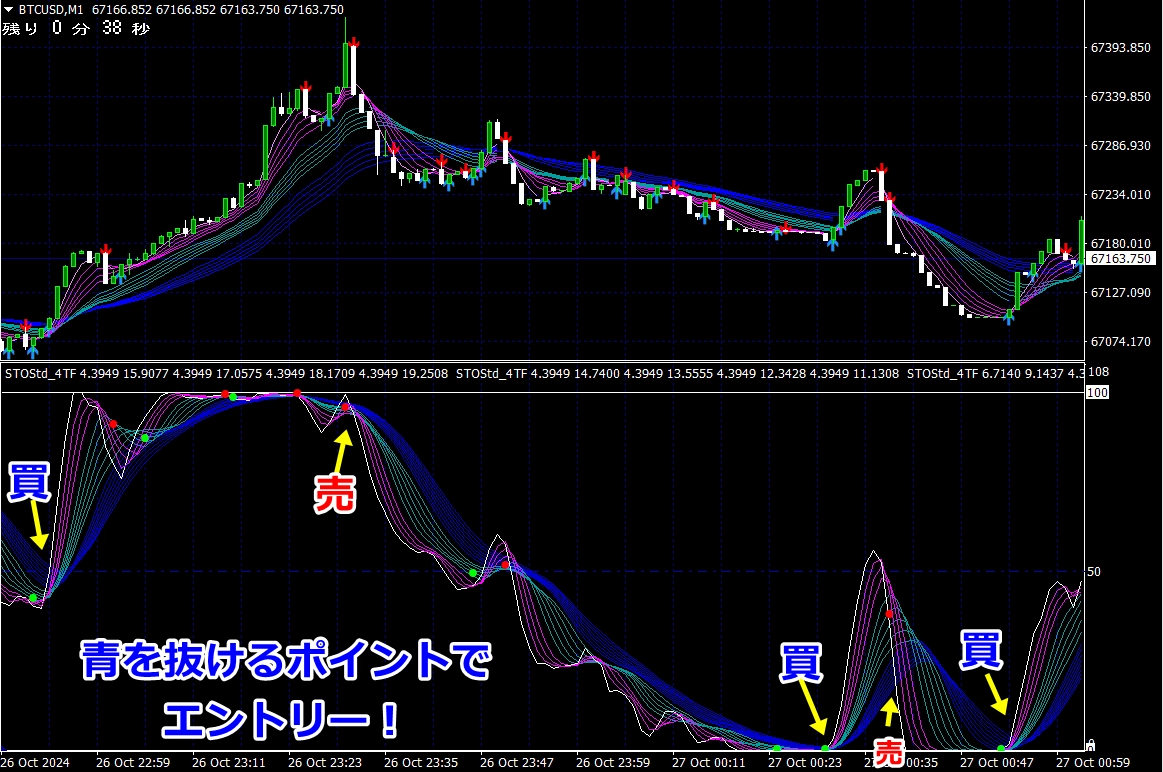 ② 矢印サイン点灯状態で、インジケーターのピンク色の帯が、緑の帯を下からすくい上げるような形状であれば、現在のローソク足が確定する数秒前か確定の直後に1分判定または3分判定でハイエントリーします。