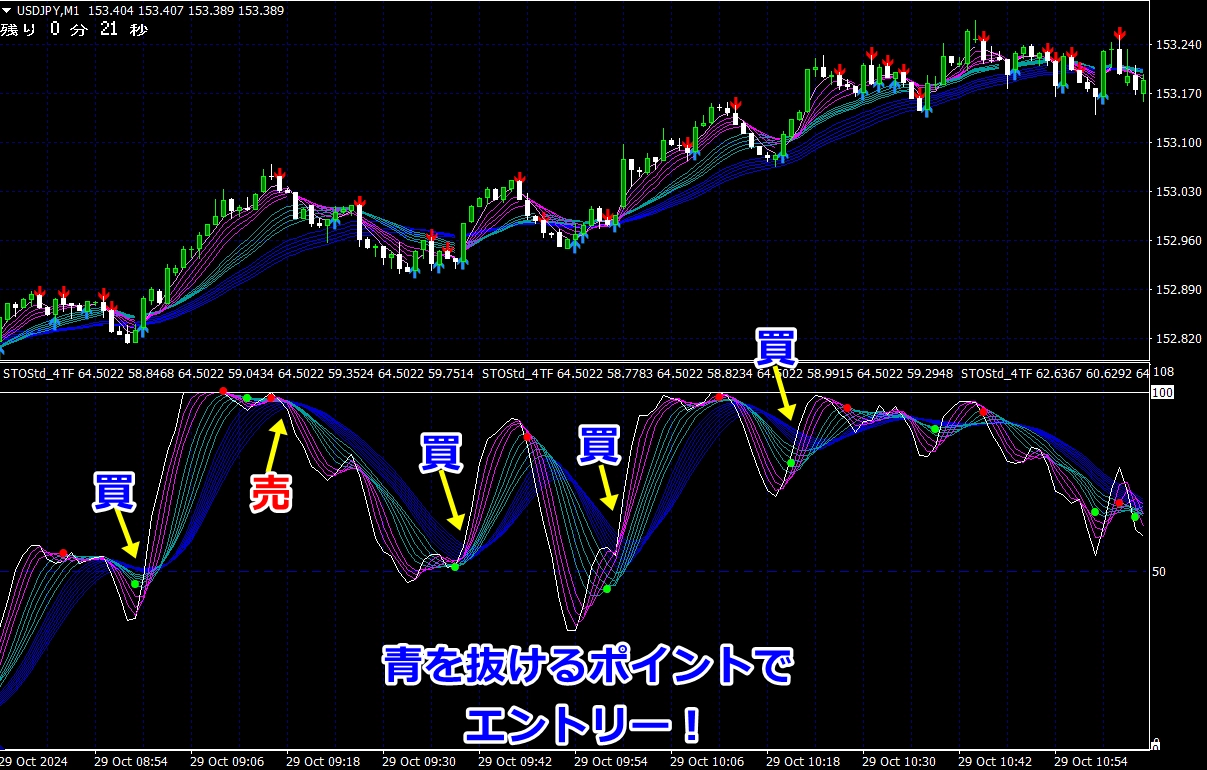 ※ サイン点灯=エントリーではありませんので、インジケーターが緑帯をすくい上げるような形状でない場合は、エントリーしません(サイン点灯でエントリーできる頻度は、数回に1度くらいです)。
