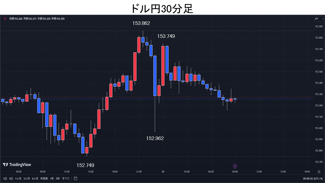 東京時間、ドル円は時間外の米10年債利回りの低下や、仲値にかけて本邦輸出企業のドル売り観測などで、152.74円まで下落。欧州時間、時間外の米10年債利回りが上昇しだすと、ドル円は153円台を回復。NY時間、米10年債利回り上昇を受け、ドル円は153.86円まで上昇。その後、9月米JOLTS求人件数が744.3万件と予想の800.0万件を大幅に下回ると152.96円まで下落。しかし、同時に発表された10月米消費者信頼感指数が予想を上振れた事などもあり、ドル円は153.74円まで上昇。その後、米7年債入札が好調だった事で米10年債利回りが低下し始めると、ドル円は153円台前半へ失速。