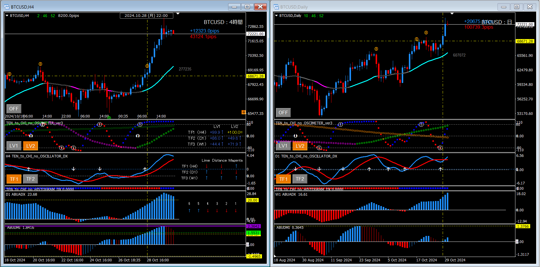 【2024年10月30日】天と地のインジケーターのデイスイング手法を使用した過去検証(ビットコイン)