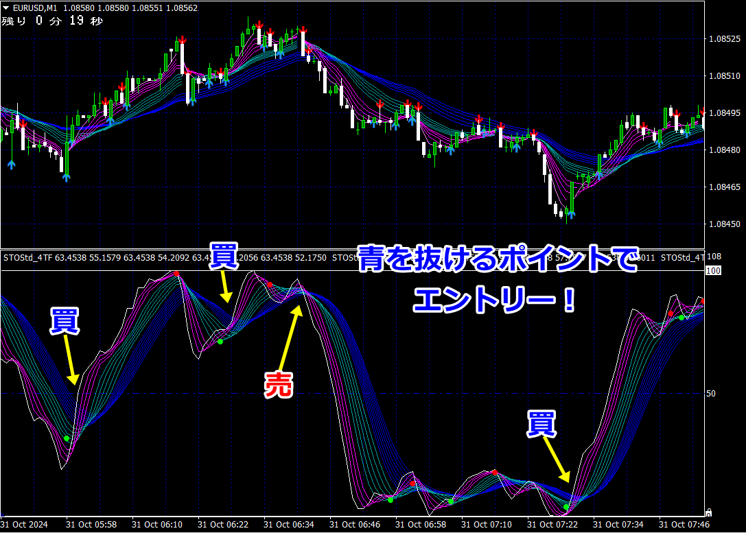 インジケーターの帯はピンク・緑・青の3層構造で、3層の帯は、収斂と拡散を繰り返しますので、 上昇時は、上から ピンク・緑・青 の並びとなり、下落時は、その逆で、上から青・緑・ピンクの並びになります。