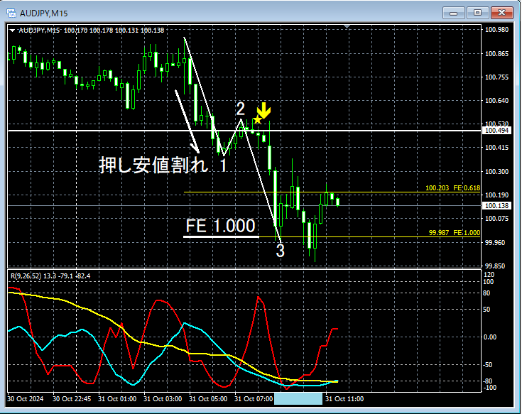 また、RCI26(中期RCI)の底値圏までの下げに対応して、プライスはフィボナッチエクスパンションの1.000(値幅観測論におけるN計算値)付近まで下げている。
