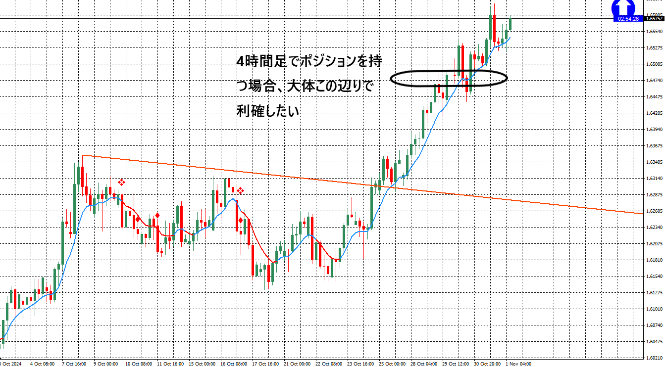 しかし、4時間足でポジションを持つとなると、大体4日かかるので長く持つのが苦手な方にとっては大変かと思います。