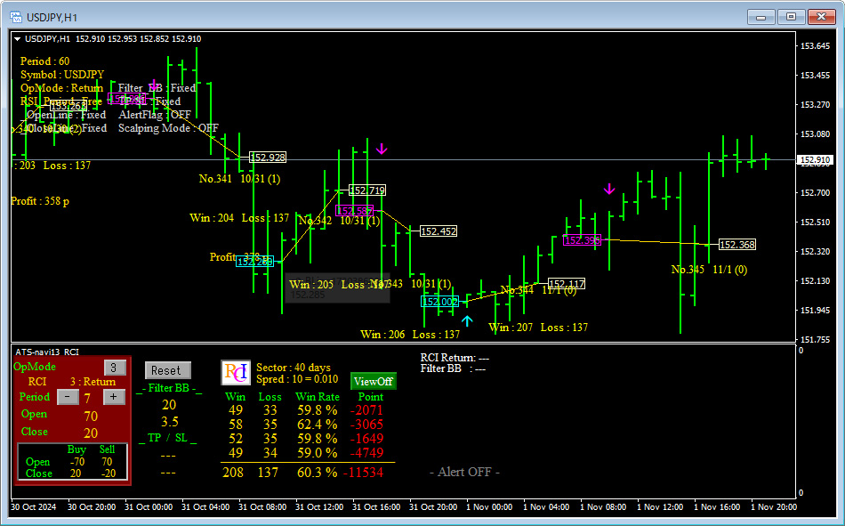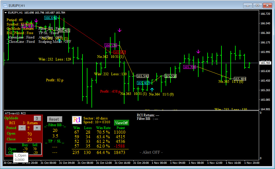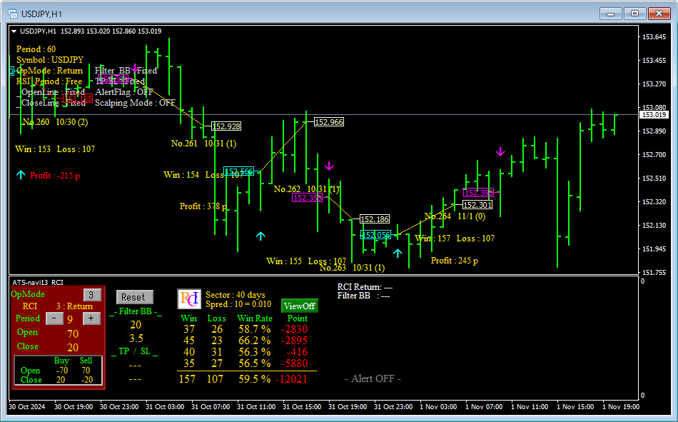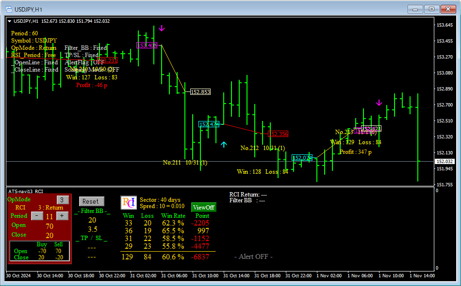 皆さんご存知の通り、RCIの本数を変えることでRCIの反応速度や信頼性が大きく変わります。例えば、短い本数を設定すれば、価格の変動に対して敏感に反応しますが、ダマシのシグナルが増えやすい傾向にあります。一方、長い本数を設定すれば、相場の大きな流れに合わせた安定したシグナルが得られますが、その分エントリーやエグジットのタイミングが遅れがちです。