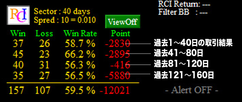 4期とは、上の表の「-2830」「-2895」「-415」「-5880」の4つの段です。1つの段が40日分の日足を基にした取引結果です。最上段から直近になっています。このように、ATSでは、設定したRCIの値の過去(4段で過去160日分)の取引状況が一目でわかるようになっています。