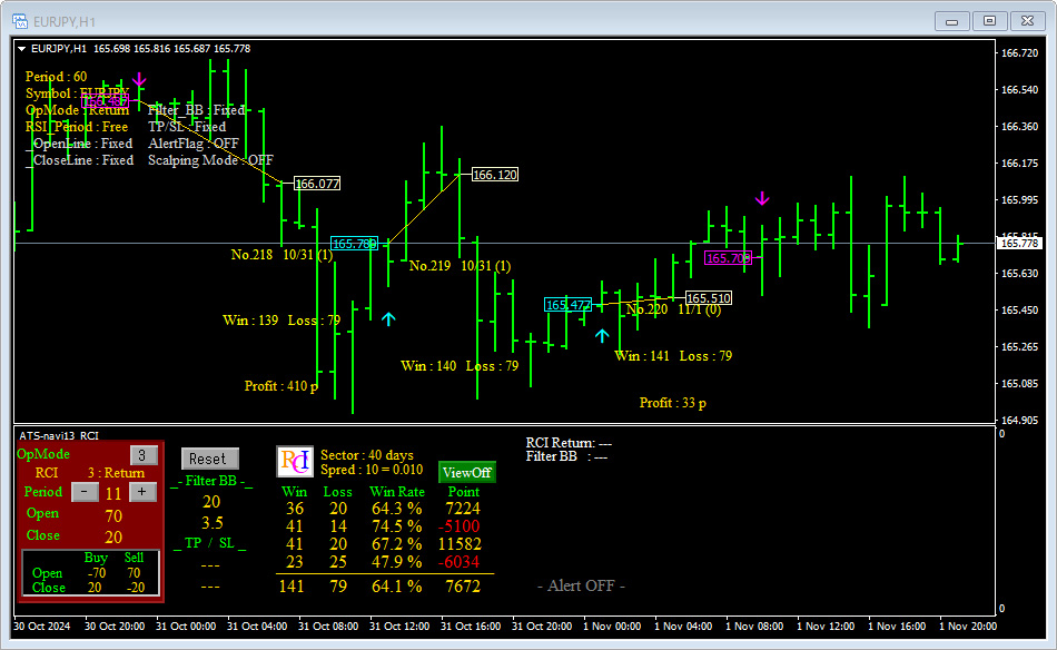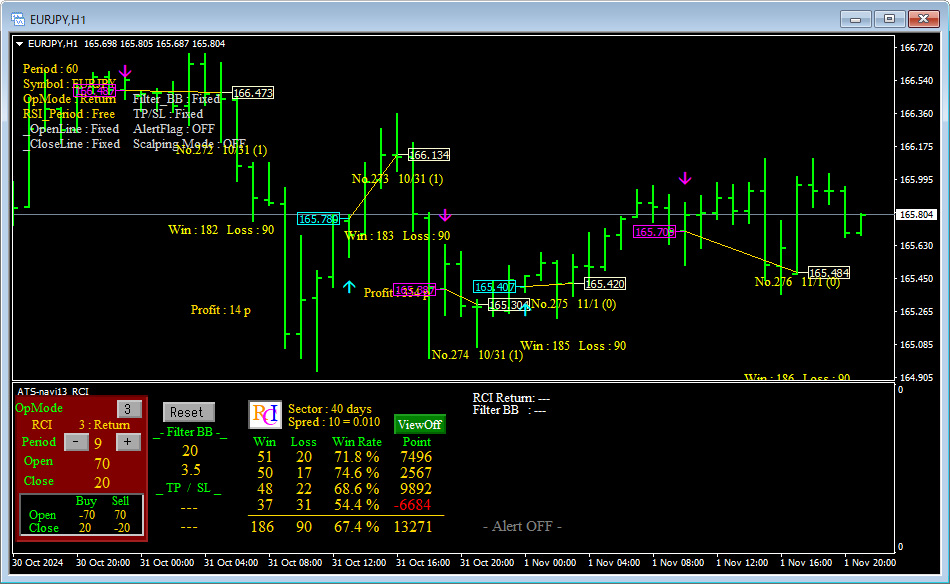 この時のEURJPY1Hでのチャートにおいては、9本よりも7本の方が勝てた!という事がわかります。