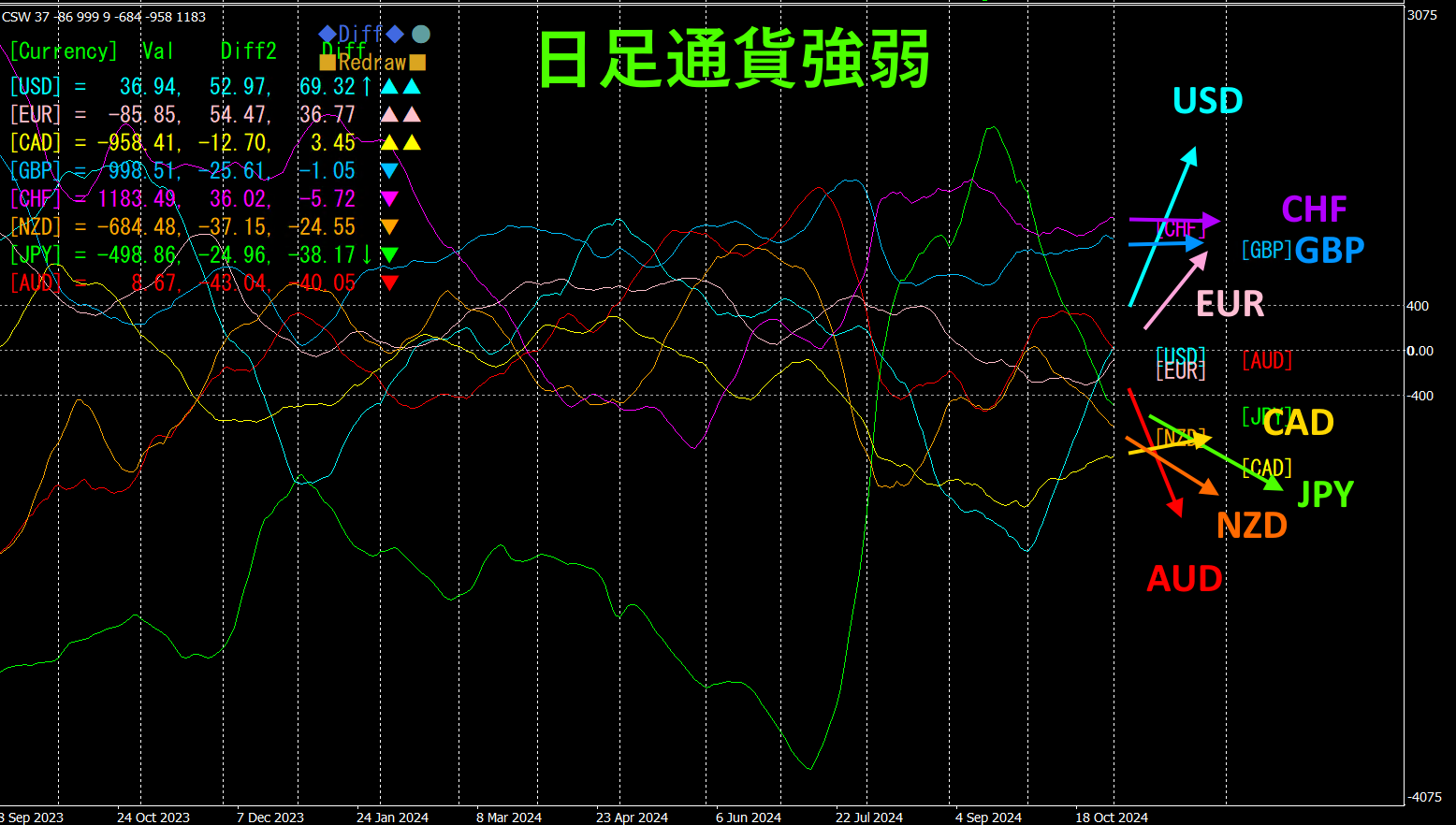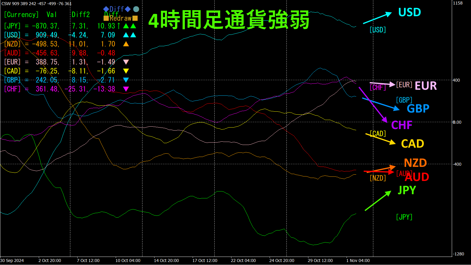 4時間足では、JPY、USD、NZDが上向き、CHF、GBP、CAD、EURが下向きになっています。