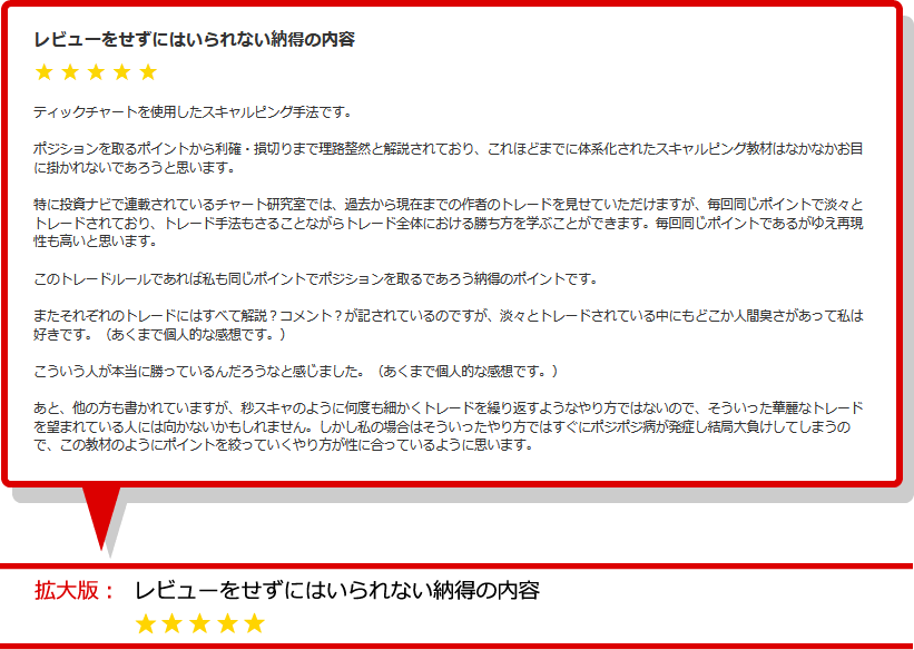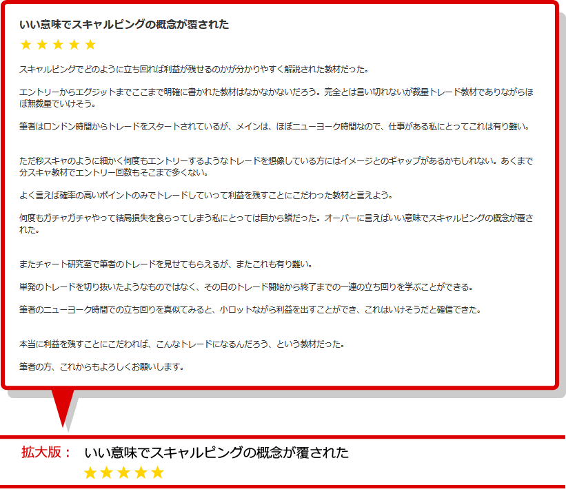 ポジションを取るポイントから利確・損切りまで理路整然と解説されており、これほどまでに体系化されたスキャルピング教材はなかなかお目に掛かれないであろうと思います。