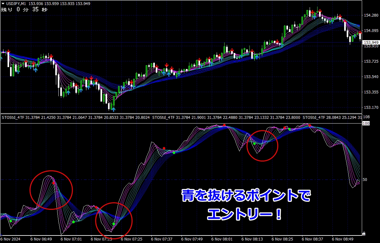 ※ サイン点灯=エントリーではありませんので、インジケーターが緑帯をすくい上げるような形状でない場合は、エントリーしません(サイン点灯でエントリーできる頻度は、数回に1度くらいです)。