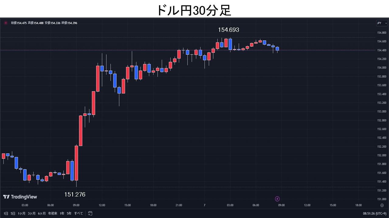トランプ・トレード活発化、米10年債利回り上昇受け、ドル円は154円台後半へ上昇。
