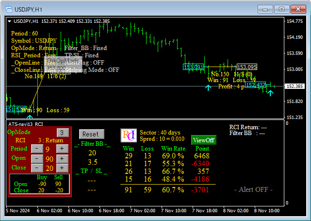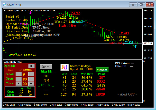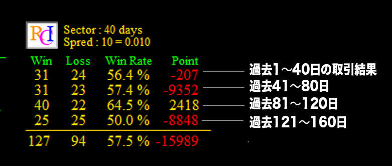 この取得条件下における160日( = 40日×4期Sec)の合計は、-15,989ポイントとかなり悪い成績ですね。