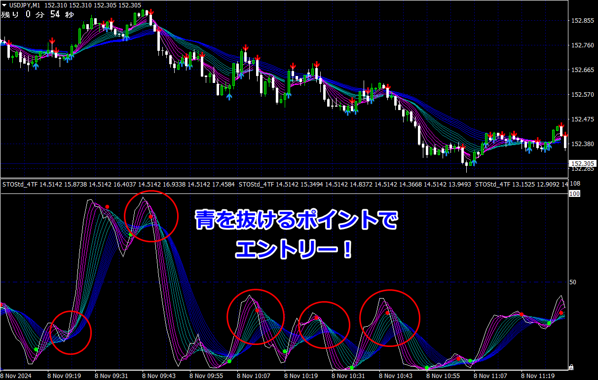 インジケーターの帯はピンク・緑・青の3層構造で、3層の帯は、収斂と拡散を繰り返しますので、 上昇時は、上から ピンク・緑・青 の並びとなり、下落時は、その逆で、上から青・緑・ピンクの並びになります。