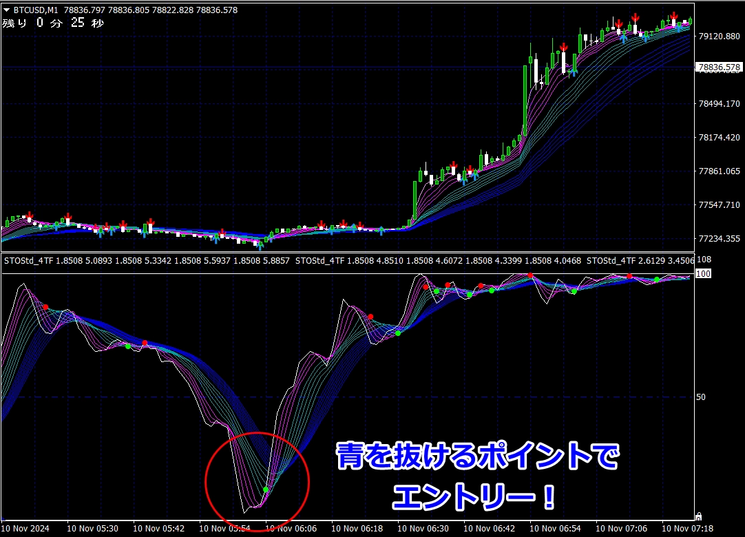 ② 矢印サイン点灯状態で、インジケーターのピンク色の帯が、緑の帯を下からすくい上げるような形状であれば、現在のローソク足が確定する数秒前か確定の直後に1分判定または3分判定でハイエントリーします。