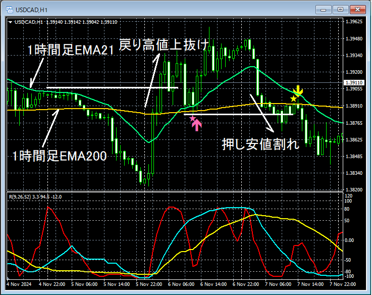上の1時間足(この例における下位足)では、戻り高値を上抜けした後、1時間足EMA21や1時間足EMA200付近まで下げたところでmBDSR(RCI2本フィルター)の押し目買いサインが点灯して、プライスはしっかり上昇していることが分かる。また、その後、押し安値を下抜けした後、1時間足EMA21や1時間足EMA200付近まで上昇したところでmBDSR(RCI2本フィルター)の戻り売りサインが点灯して、その後、プライスはしっかり下げていることが分かる。(RCIを使った上位足から下位足への落とし込みの結果として、1時間足を見ているのであって、適当に1時間を見ているわけではない。)