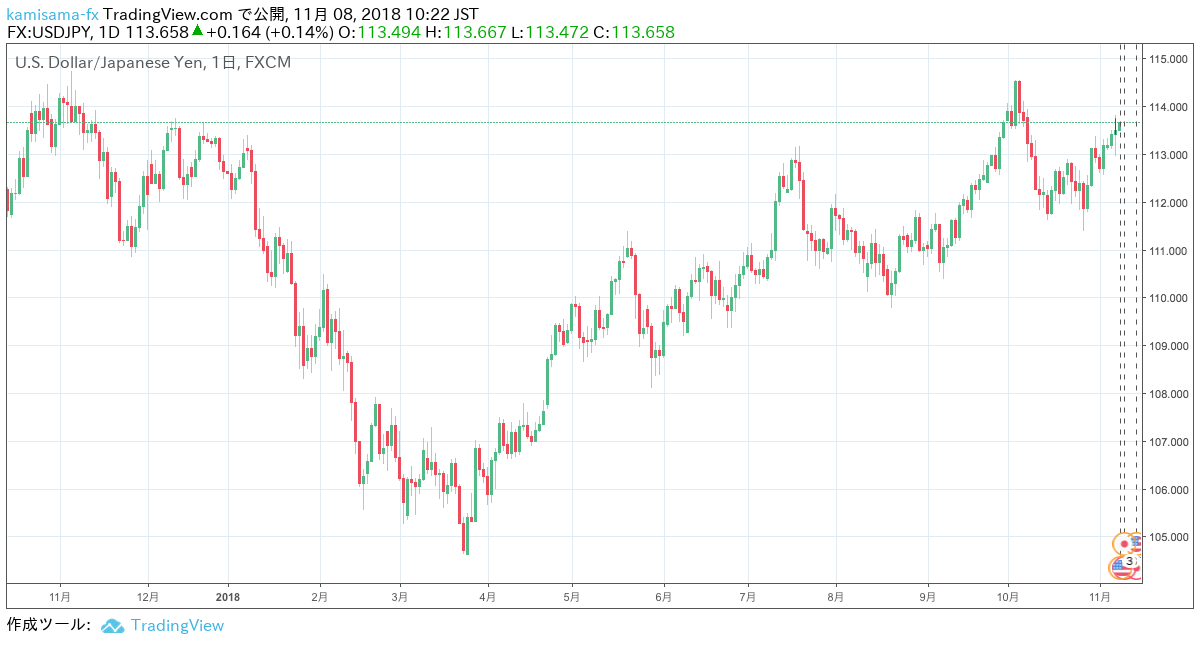 ドル円はロングを維持します。米中間選挙の結果の結果を受けて、米国株高・ドル円上昇となっています。不透明感の一つが払しょくされたことで、ドル円は上がりやすくなるでしょう。日本株も堅調であり、株価が安定していれば、いまはドル円が上がりやすいといえます。あとは114.54円を超えるかを注視することになります。