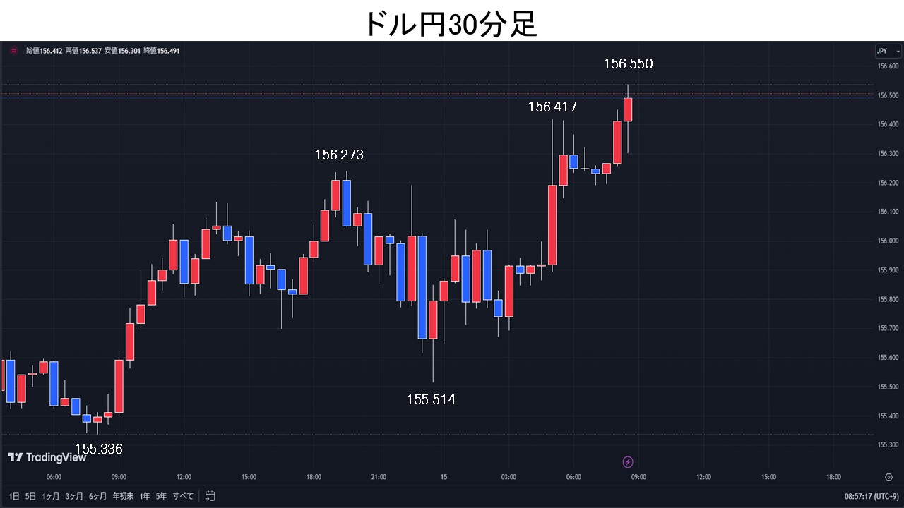 パウエルFRB議長のタカ派発言受け、ドル円は156円台半ばへ上昇。