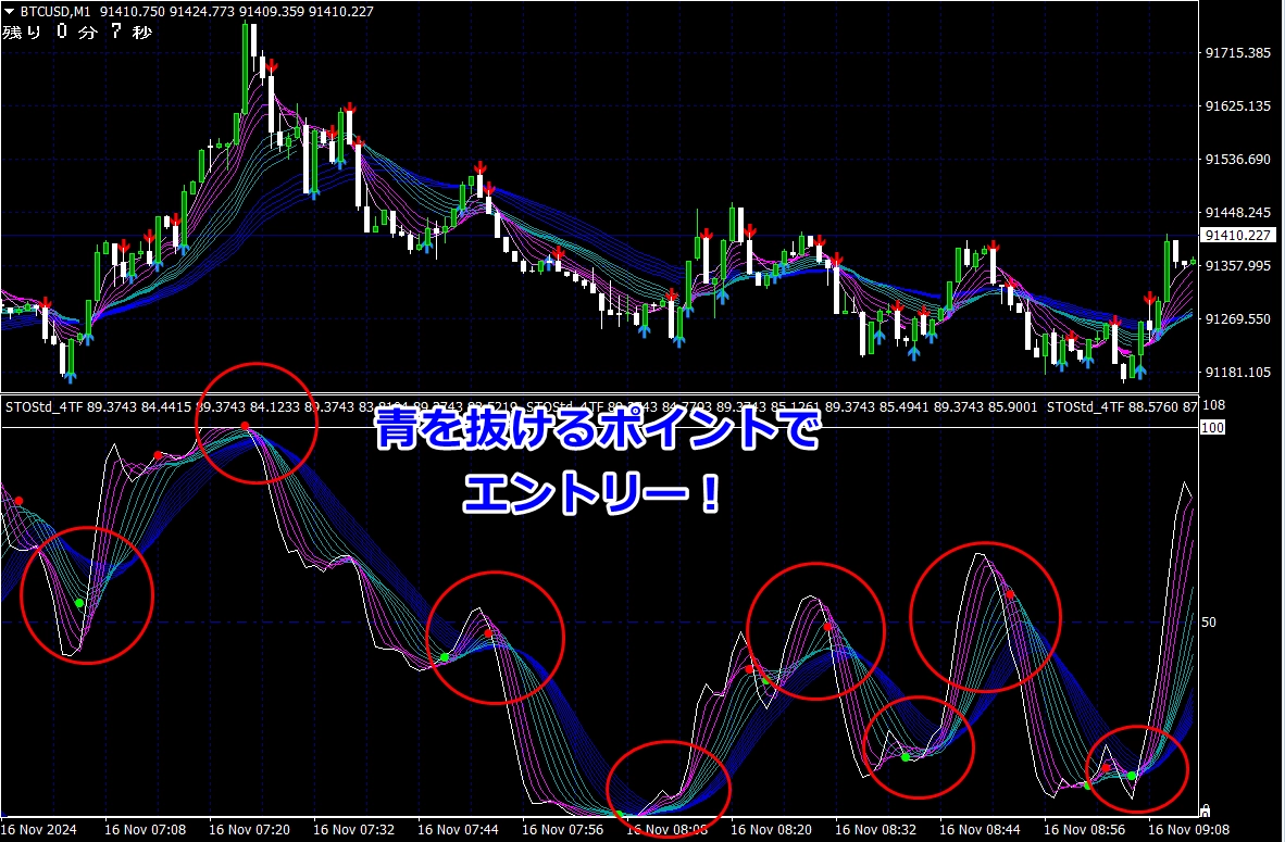 ② 矢印サイン点灯状態で、インジケーターのピンク色の帯が、緑の帯を下からすくい上げるような形状であれば、現在のローソク足が確定する数秒前か確定の直後に1分判定または3分判定でハイエントリーします。