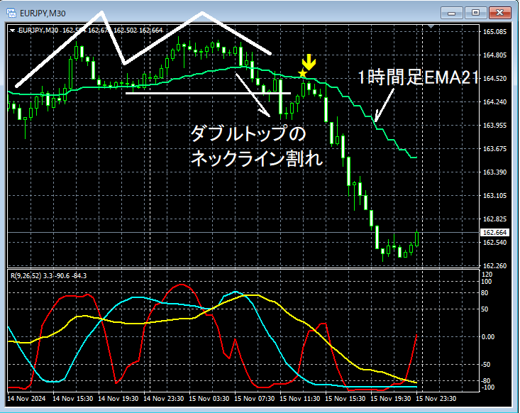 【昨日 2024.11.15 のユーロ円】ダブルトップと移動平均線とmBDSR(RCI2本フィルター)の戻り売りサイン