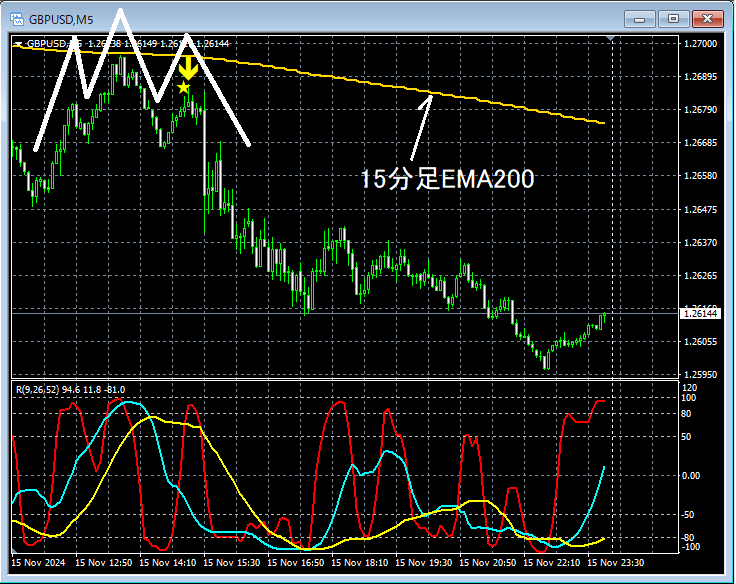 【昨日 2024.11.15 のポンドドル】三尊(ヘッドアンドショルダー)と移動平均線とmBDSR(RCI2本フィルター)の戻り売りサイン