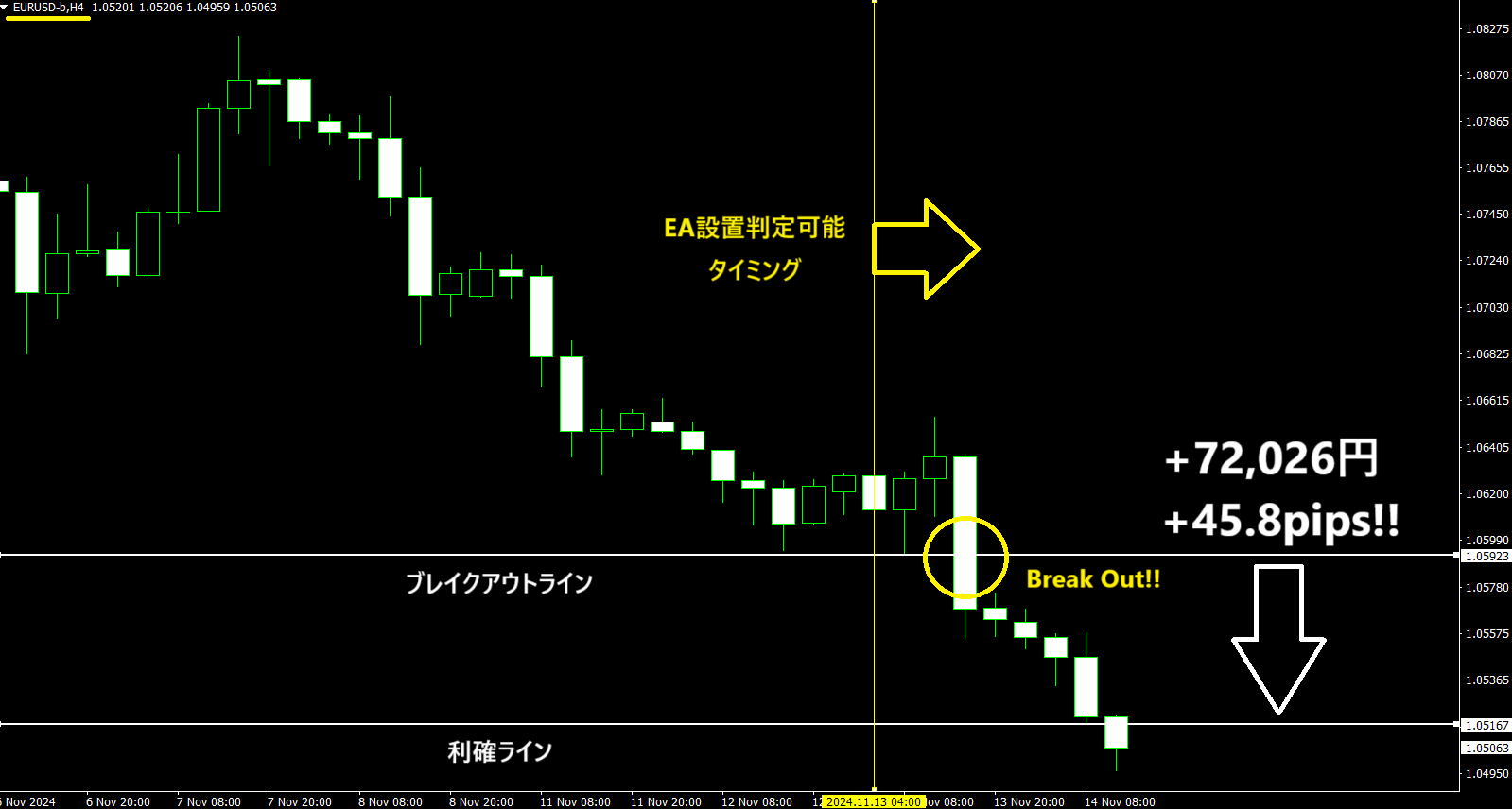 ④11/13 16:00(日本時間23:00)ブレイクアウト発生、EAにより自動エントリー