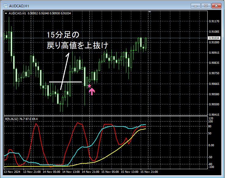 【昨日 2024.11.15 のオージーカナダ】下位足の戻り高値上抜けとmBDSR(RCI2本フィルター)の押し目買いサイン