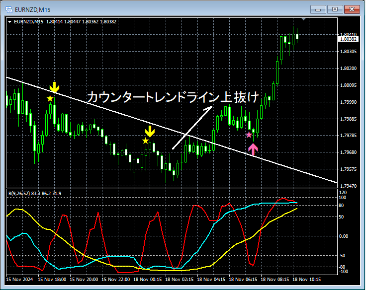 【本日 2024.11.18 のユーロニュージー】カウンタートレンドラインとmBDSR(RCI2本フィルター)の押し目買いサイン