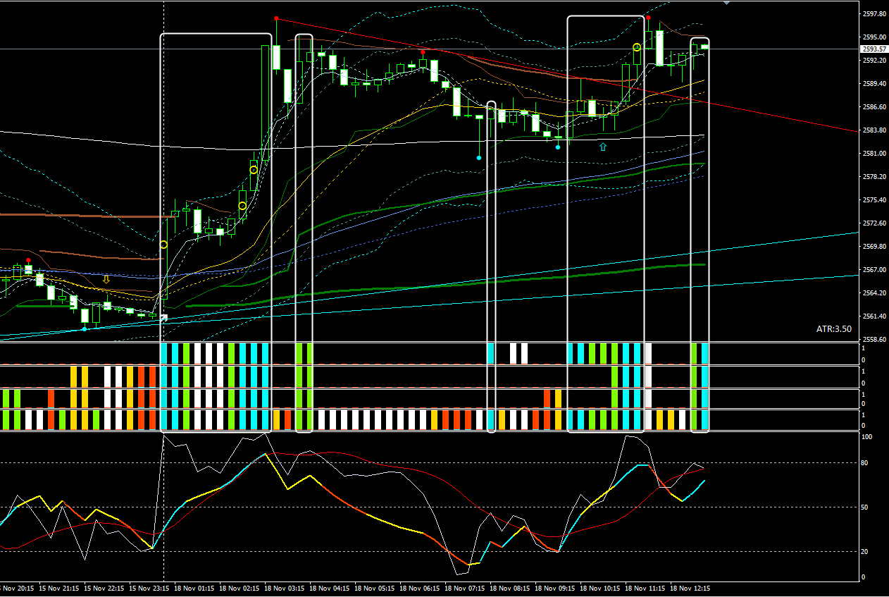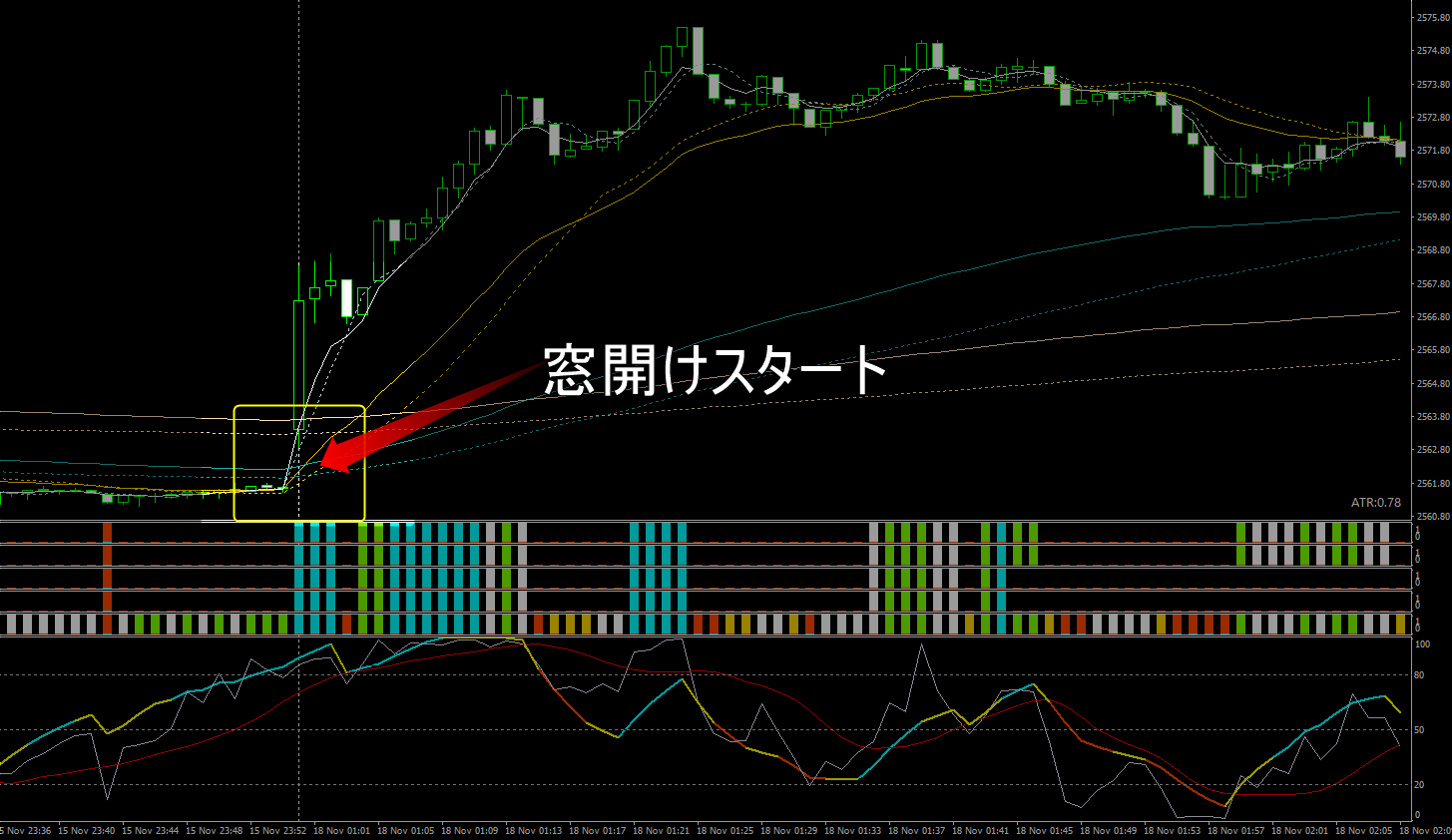 値動きの向き、強さ(様子見)を表すシンクロバンドは、開場直後から上昇を示唆(青・緑)