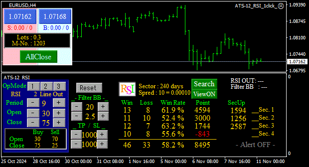 もう一つは、EURUSD H4 ラインアウトで取得、RSIの足の本数は9、RSIオープンレベルは30、クローズレベルは75という設定値です。