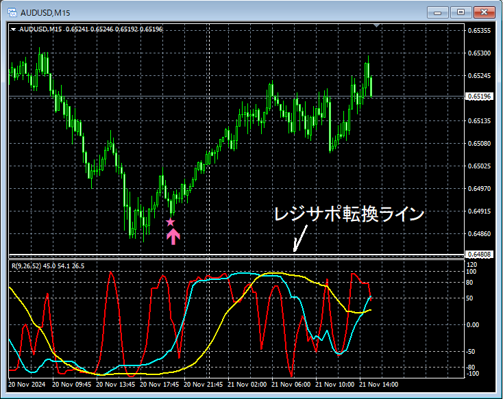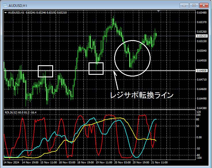 また、この例の場合、損切りラインを直近安値の少し下に置くことなどによりリスクリワードの良い優位性の高いトレードが可能である。