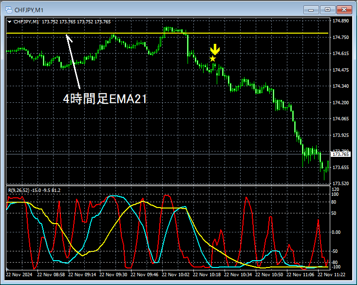 上位足の状況は省略するが、この場合に重要視している4時間足EMA21付近まで上昇してきており、戻り売りを狙ってもおかしくない場面かもしれない。4時間足EMA21付近で反落の兆候がないかチャートの推移を見守ることにする。